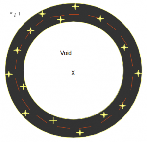 As this energy moves rapidly away from the Big Bang (point X in Fig.1) it will leave a growing void inside the shell of energy. This energy / plasma starts cooling and changing to gas, creating gravity and gas pressure. The void has zero pressure as does the space outside of the shell so doesn’t hinder the first expansion. The newly created gas and the associated gas pressure starts the second expansion. This second expansion forces gas from this what I will call the mid point or origin of the second expansion both inwards and outwards. It creates a thickening shell while the shell itself continues to expand from the Big Bang.